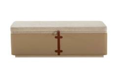 Patul este tapitat cu material textil crem.