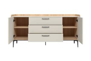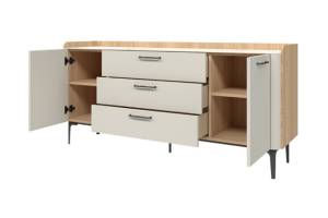 Comoda cu 2 usi si 3 sertare AIR 175x83x48cm Pepper White/ Stejar Furneo - sticla cu model de marmura Calcatta Oro, cadru, manere si picioare Antracit
