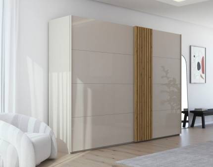 Dulap cu usi glisante KRONACH COLOR I 218x210x59cm alb alpin/ sticla neagra, maner aluminiu